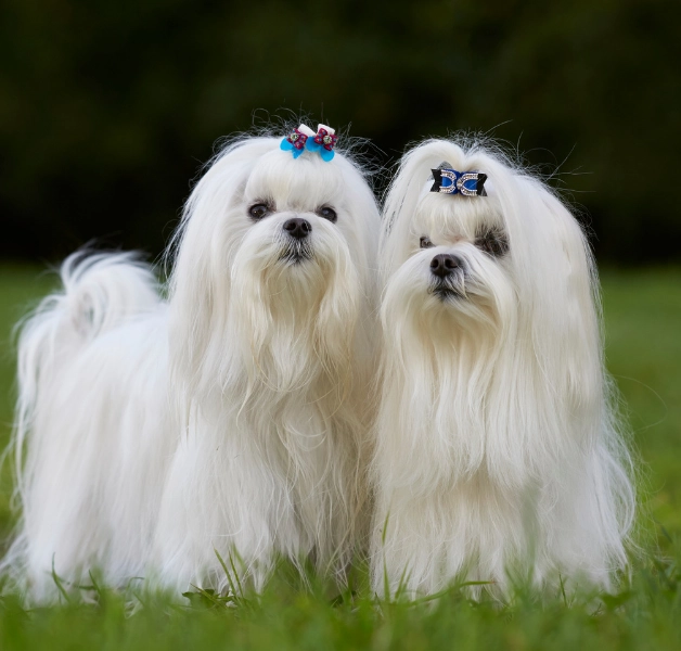 O Maltês é uma raça de pequeno porte, reconhecida por sua pelagem longa, branca e sedosa. Seu corpo é compacto, com olhos escuros, expressivos e nariz preto. Apesar de sua aparência elegante, é uma raça resistente e ativa.